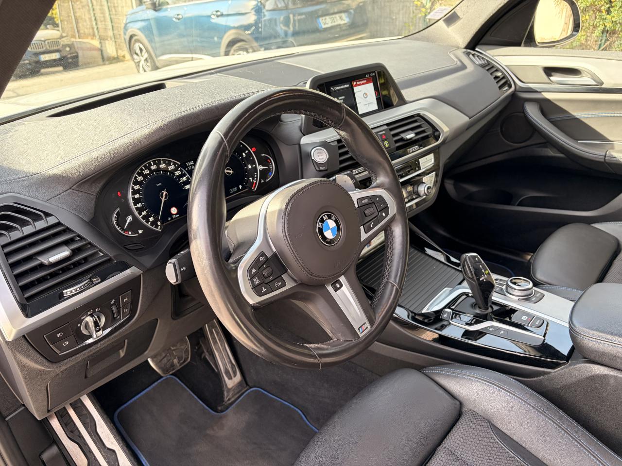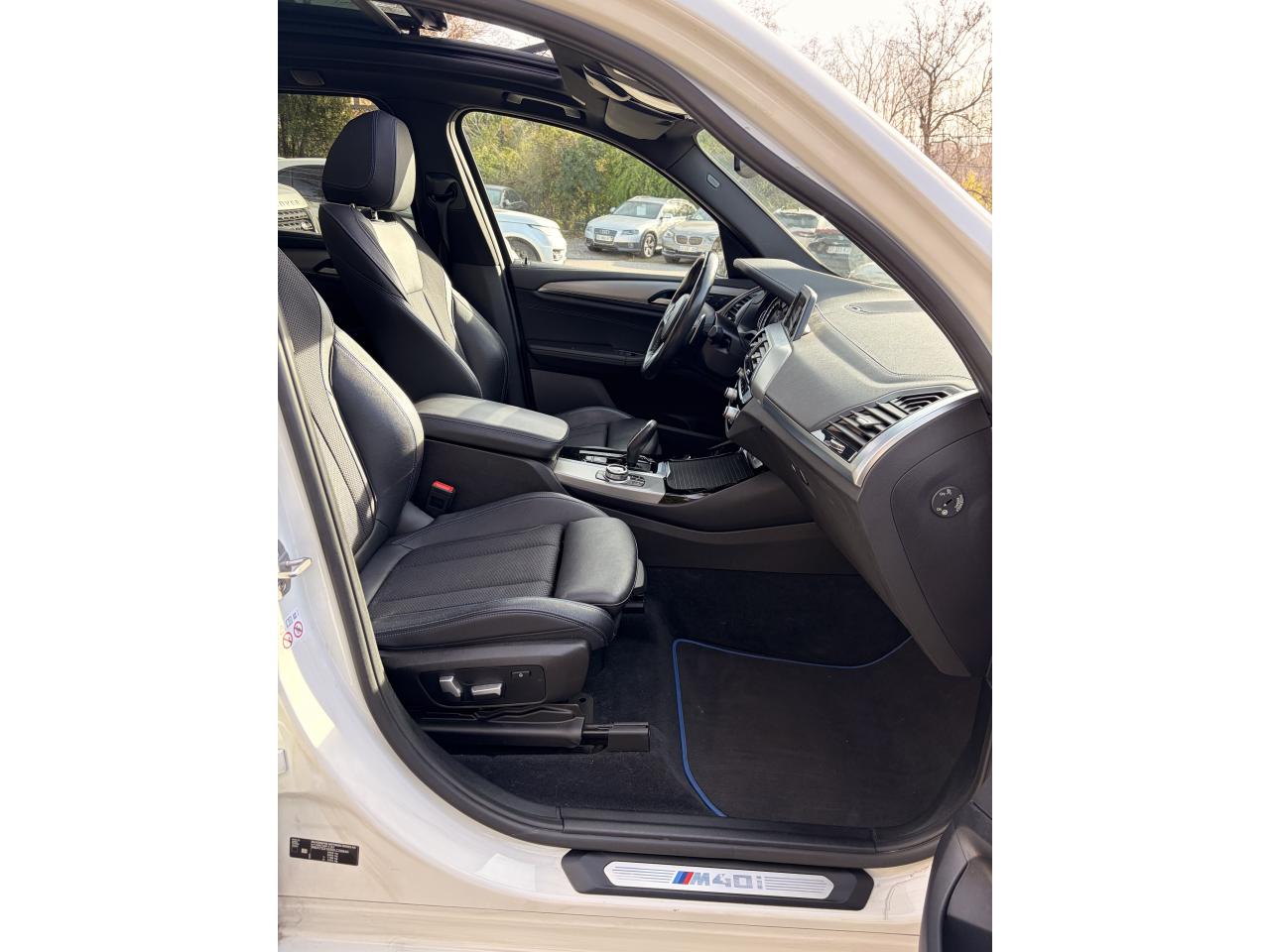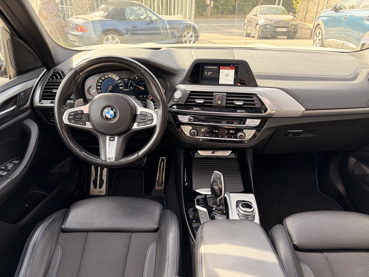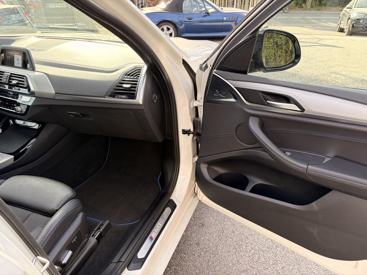 Accoudoir central avant et arrièreAffichage BMW EfficientDynamics dans le cadran d'instrumentationAirbags de tête avant/arrièreAntenne de toit « aileron de requin »Anti-démarrage électronique EWS IVAppel d'Urgence Intelligent (durée de vie de la voiture)Appui lombaire ajustableAttention Assist : système de détection de somnolenceAutoradio BMW Professional, 8 touches de favoris programmables et "Controller" iDrive avec touches de raccourci, compatibilité MP3, double Tuner RDS FM, info-route (TP)Banquette arrière rabattable 40/20/40Calandre avec doubles barreaux mobiles "Active Air Stream"Ciel de pavillon anthraciteClimatisation automatique 3 zonesCommande électrique du hayonConstruction allégée intelligente BMW EfficientLightweight Carbon Core, aluminium et acierDéverrouillage électrique du hayon via la poignée ou la clé radiocommandéeDifférentiel M SportDiffuseurs aérodynamiques avant "Air Curtain"Diffuseurs aérodynamiques latéraux "Air Breather"Direction DirectDrive à démultiplication variableEclairage d’ambianceEnjoliveurs d'échappement de forme trapézoïdale à gauche et à droite, en chrome noirFeux de stop dynamiques clignotantsFilet de séparation dans le coffreFonction d'arrêt et de redémarrage automatique du moteurFrein de parking électromécaniqueFreins Sport M étriers bleuInserts décoratifs Aluminium Rhombicle avec baguette d'accentuation chrome brillant perléJantes en alliage léger 20" M style 699 M à rayons doubles Kit EclairageLecteur CDPack Advanced Full LEDPack Aérodynamique MPack BMW ConnectedDrivePerformance ControlPlanche de bord SensatecPoignées de portes couleur carrosserieProjecteurs antibrouillard à LEDRadars de stationnement avant et arrière PDCRails de toit noir brillant Shadow line BMW IndividualRétroviseurs extérieurs électrochromes rabattables électriquementSélecteur de mode de conduite - 3 modes : "ECO PRO", "Confort" et "Sport"Sellerie Tissu-cuir 'Vernasca' Schwarz avec sûrpiqures contrastées bleuesServices ConnectedDrive (3ans)Seuils de porte avec désignation "X3 M40i"Shadow Line brillant BMW IndividualSièges Advanced pour conducteur et passager avantSièges avant électriques à mémoires conducteurSièges Sport à l'avantSuspension DirectDriveSuspension Sport MSystème de fixation ISOFIX aux places arrière latéralesSystème de manoeuvres entièrement automatiques "Park Assist"Tapis de sol en veloursTeinte de carrosserie "Alpinweiss" unieVariable Sport SteeringVolant M gainé cuirVolant réglable en hauteur et en profondeur
