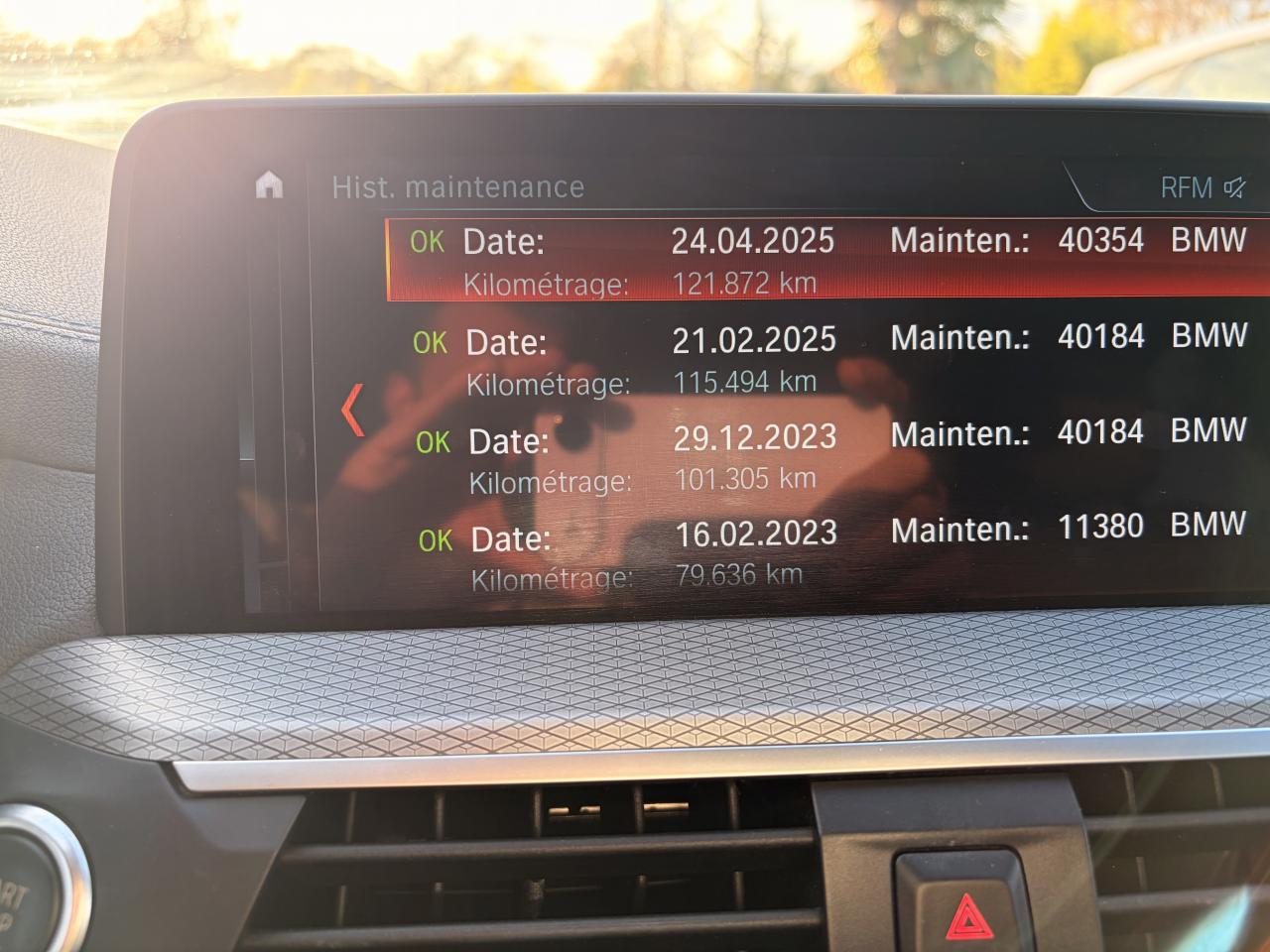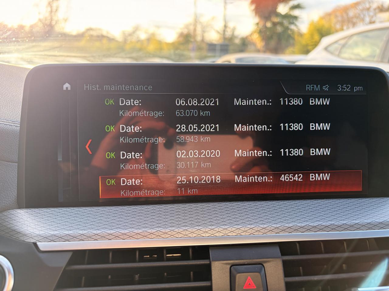 4 roues motricesBluetoothCaméra de reculCarplayGPS couleur - tactileAirbag passager avant déconnectableAirbags latéraux conducteur et passager avantAntenne de toit « aileron de requin »Appel d'Urgence Intelligent (durée de vie de la voiture)Autoradio BMW Professional, 8 touches de favoris programmables et "Controller" iDrive avec touches de raccourci, compatibilité MP3, double Tuner RDS FM, info-route (TP)BMW Connected+Boîte de vitesses automatique à huit rapports avec Steptronic et palettes au volantClimatisation automatique 3 zonesCommande électrique du hayonContrôle Dynamique de la Traction DTCDétecteur de pluie et allumage automatique des projecteursDéverrouillage électrique du hayon via la poignée ou la clé radiocommandéeDiffuseurs aérodynamiques avant "Air Curtain"Feux de jour à LEDFrein de parking électromécaniqueKit de mobilité BMWKit EclairageLecteur CDLève-vitres avant et arrière électriques avec commande par impulsion et sécurité enfantsLigne M SportLimiteur et régulateur de vitesse avec maintien de la vitesse en descentePack BMW ConnectedDrivePack InnovationRadars de stationnement avant et arrière PDCRétroviseur intérieur électrochromeRétroviseurs extérieurs électriques chauffants, asphérique côté conducteurSélecteur de mode de conduite - 3 modes : "ECO PRO", "Confort" et "Sport"Système de fixation ISOFIX aux places arrière latéralesSystème de manoeuvres entièrement automatiques "Park Assist"Teinte de carrosserie "Alpinweiss" unieTouches multifonctions sur le volantVolant réglable en hauteur et en profondeur