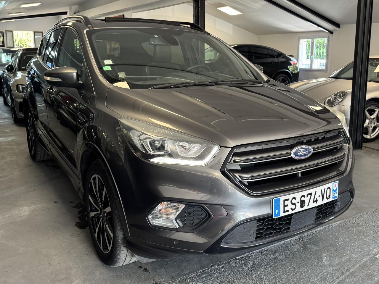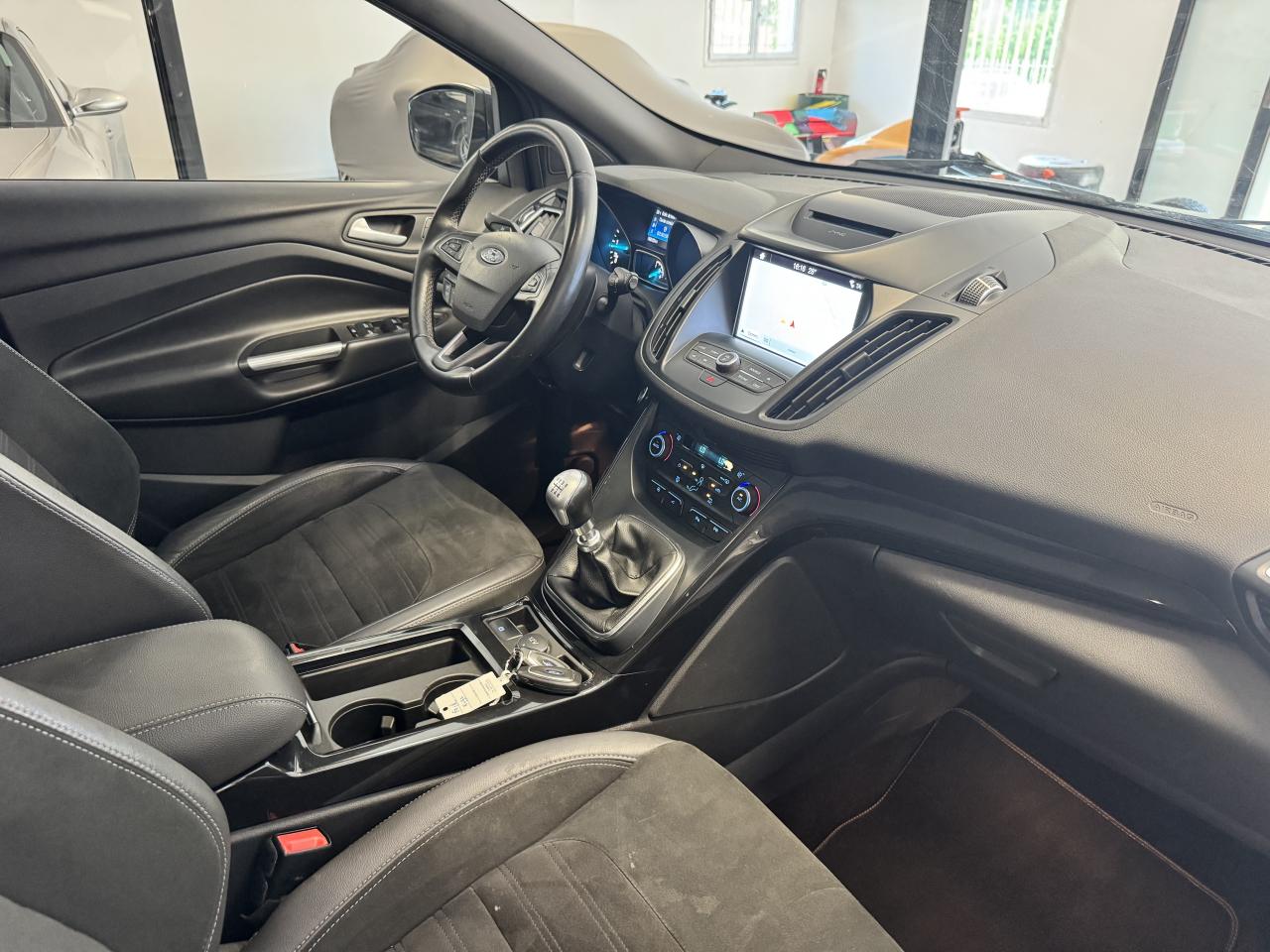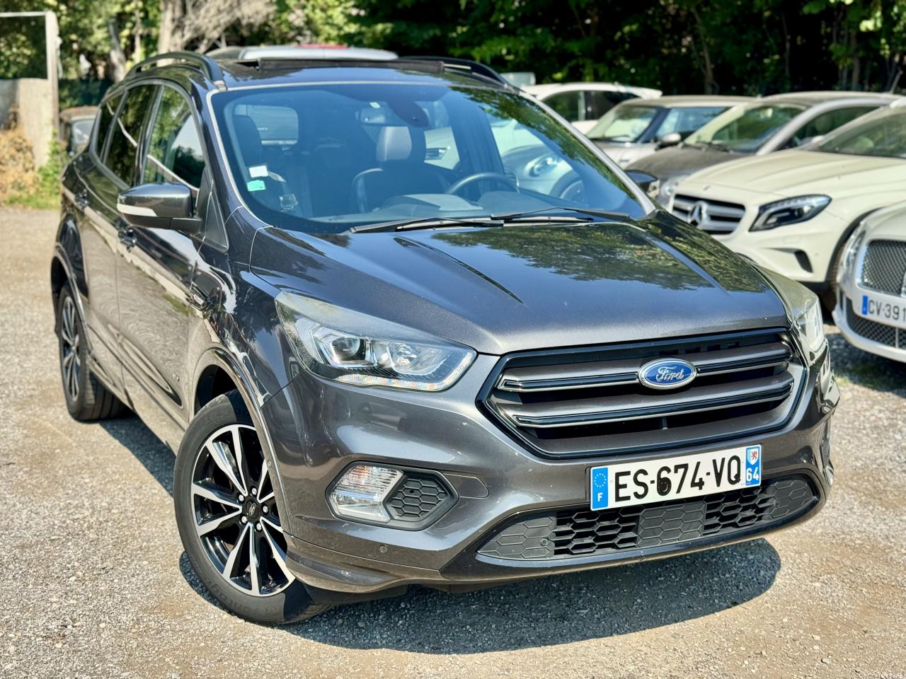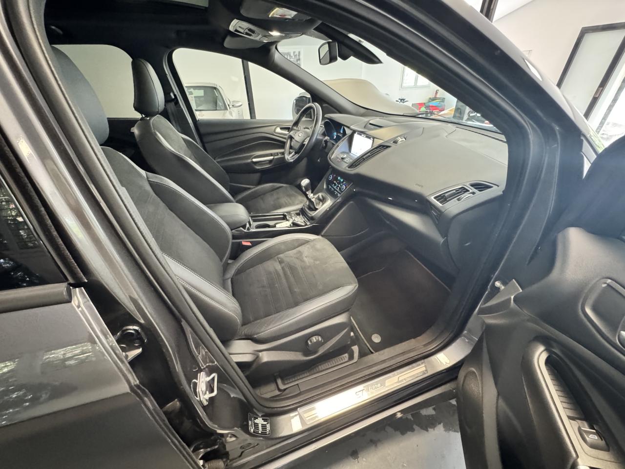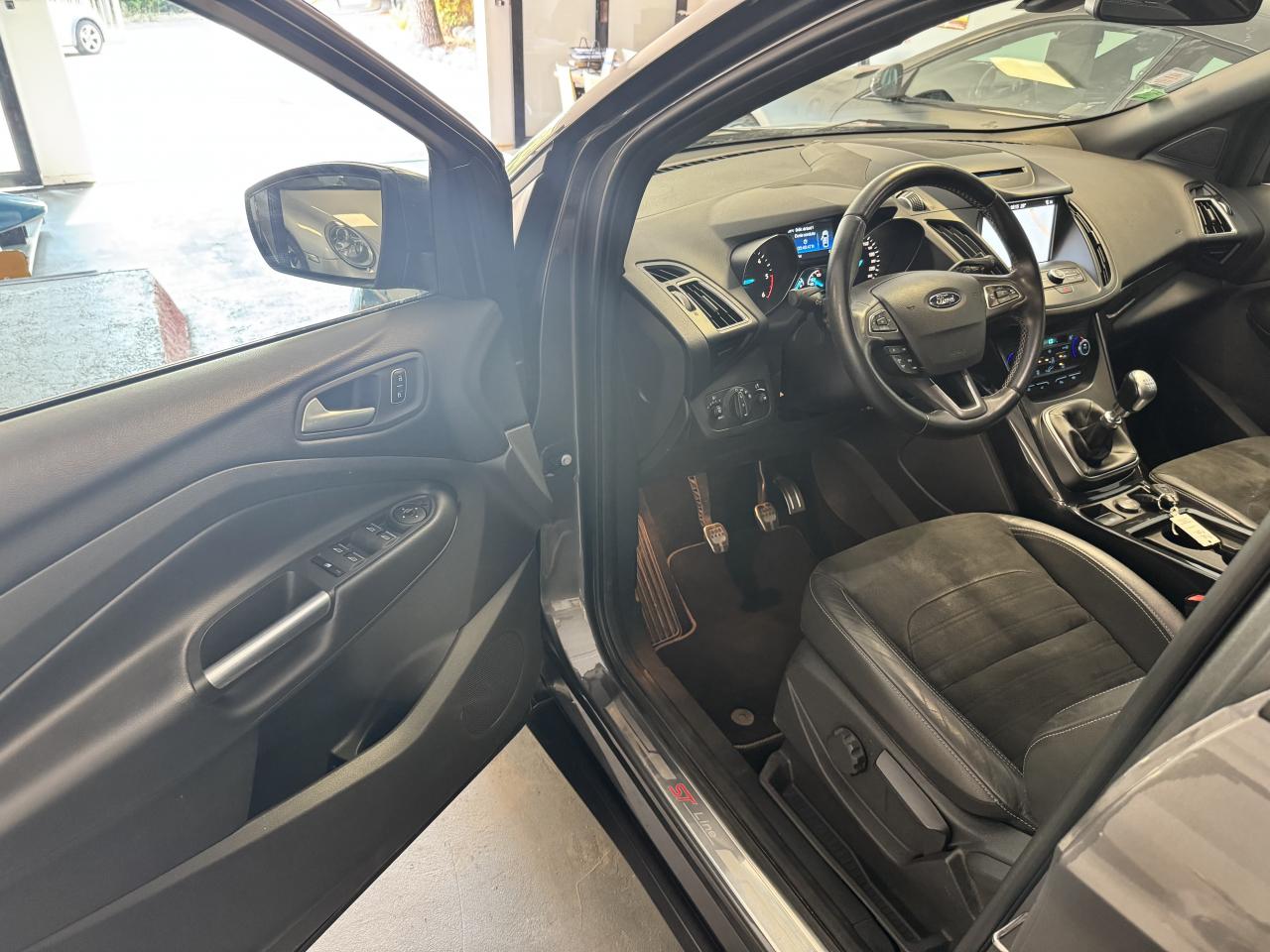 2 Fixations Isofix à l'arrièreAccoudoir central arrièreActive Park Assist avancé. Inclus aide au stationnement avant et arrièreAide au démarrage en côteAirbags Ford rideaux 1ère et 2ème rangéesBarres de toit noiresBoucliers avant et arrière couleur carrosserieBouton de démarrage "Ford Power"Clignotement automatique des feux stop en cas de freinage d'urgenceClimatisation automatique bi-zoneDirection assistée électrique variable EPASEasy Fuel (trappe sans bouchon avec détrompeur de carburant)Echappement double sortieEclairage de coffreESP (régulation de comportement dynamique) avec système de stabilisation de la remorque et BAS (freinage d'urgence assisté)Feux de jour à LEDFrein à main électriqueJantes alliage 18" noires ST-LineKit carrosserie completOrdinateur de bordPack AutomatismesPédalier en aluminiumPoignées de portes et de hayon couleur carrosseriePrises 12V avant/arrièreProjecteurs antibrouillardRégulateur et limiteur de vitesseRétroviseurs rabattables électriquement et éclairage d'approcheSeuils de portes spécifiques ST-LineSièges avant à réglage lombairesSièges avant réglables en hauteur manuellementSièges avant sport, garnissage cuir/tissu RaptonSuspensions sportSystème multimedia Ford SYNC 3 avec navigation, Bluetooth commandes vocales avancées, écran couleur 8", 2 prises USB, 6 haut-parleurs, info trafic (TMC) et accès aux points d'intérêt Michelin Intègre Apple Carplay et Android AutoSystème MyKey Génération 2Système Stop & StartTapis de sol avant et arrière à surpiqures rouges ST-LineVolant en cuir ST-Line, réglable en hauteur et en profondeur
