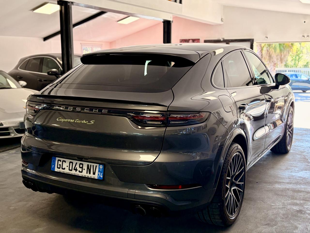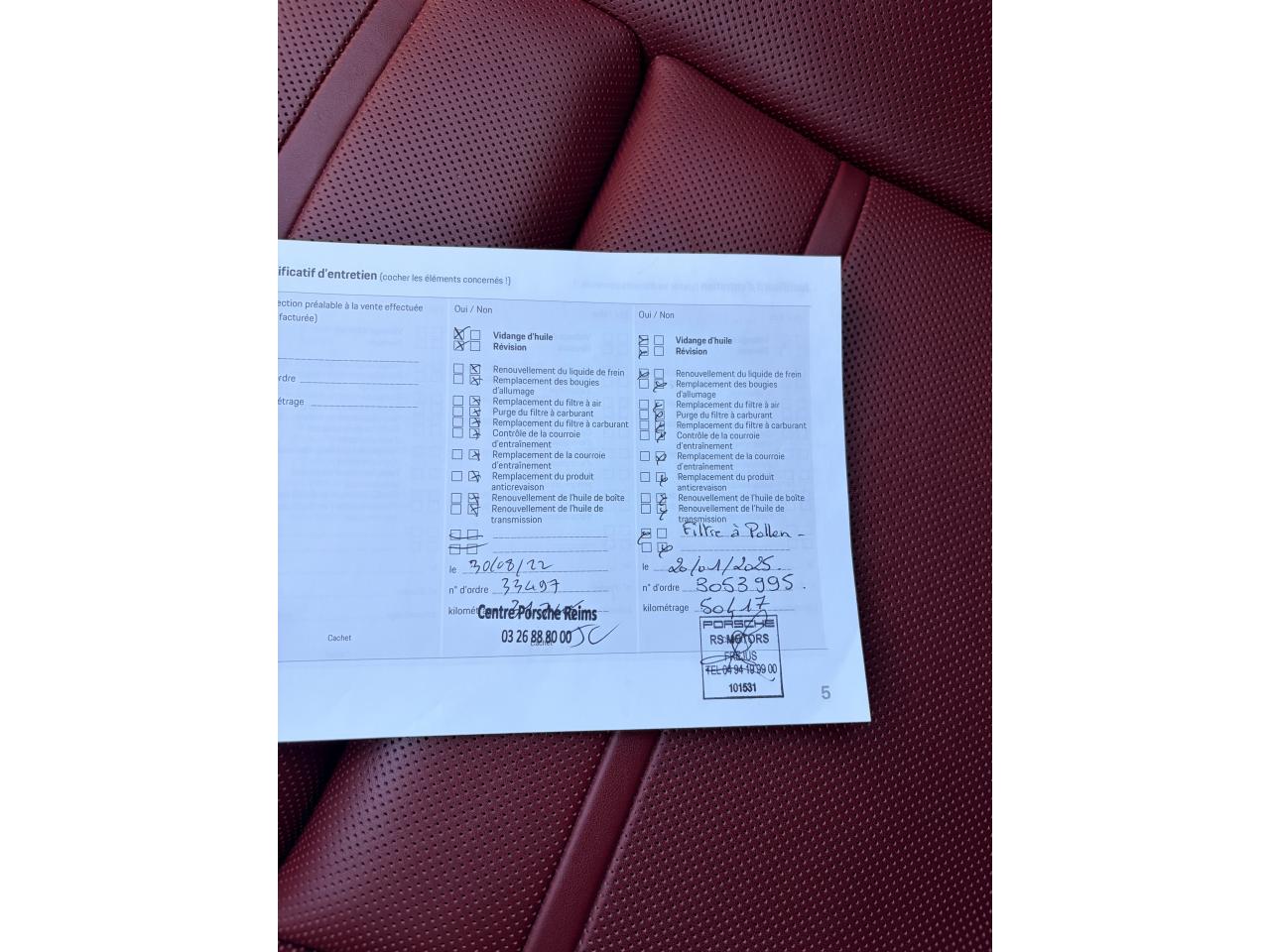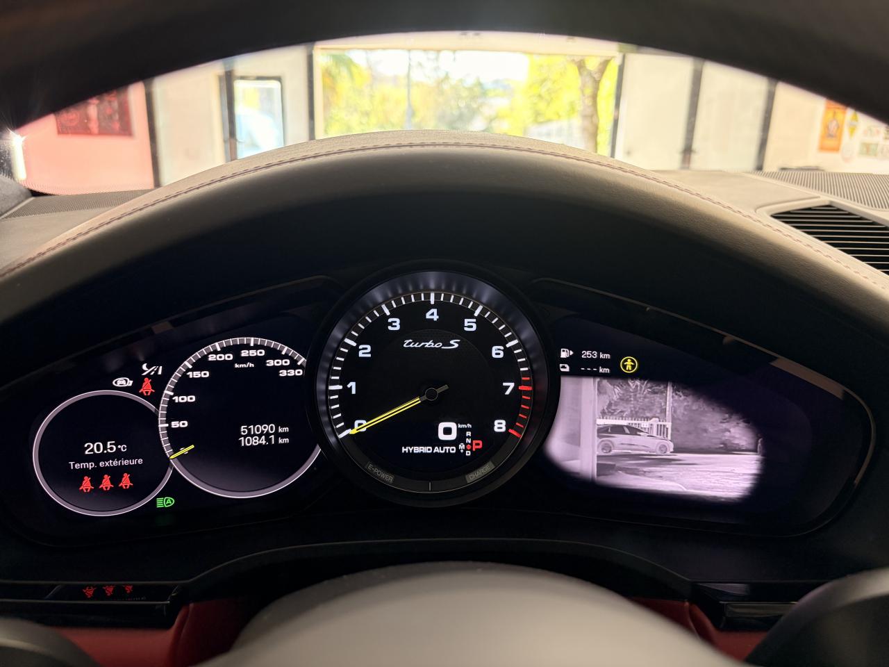 2 doubles sorties d’échappement «Turbo » 2 ports USB de chargement dans la console centrale arrière2 ports USB de chargement et de connexion dans le coffre de rangement de la console centrale avantAccoudoir central AR avec 2 porte-gobelets, réglage longitudinalAirbags rideauxAlarme et double verrouillageAllumage automatique des feux en cas d'ouverture/fermeture du véhiculeApple CarPlayAssistance à la descente (Porsche Hill Control, PHC)Assistance parking avant et arrière avec signal visuel et sonoreAvertisseur de freinage d'urgenceBecquet de toit arrière de couleur carrosserieBloc moteur en aluminiumBoîte de vitesse Tiptronic S 8 rapportsBOSE Surround Sound System avec 14 haut-parleurs et caisson de basses, puissance totale de 710 wattsCâble de charge pour prise domestiqueCapot avant actifCarrosserie de conception allégée hybride entièrement galvanisée alliant Acier et AluminiumCarrosserie élargie à l'arrièreCarrosserie hybride en aluminium (capot moteur, hayon, portières et ailes)Chargeur embarqué 7,2KWChâssis avec suspension à ressort hélicoïdauxCiel de toit en AlcantaraCompte-tours analogique central avec fond de compteur Noir et inscription « Turbos S », powermètre et aiguille en Vert AcideConcept d’éclairage de l’habitacle à LED : temporisation d’arrêt, éclairage bas d’habitacle avant et arrière, éclairage du cendrier, de la boîte à gants, du démarreurConnect Plus avec module de navigation en ligne, module téléphone LTE avec lecteur de carte SIM et accès Internet sans fil ainsi que Porsche Car Connect incluant de nombreux services Porsche ConnectDémarrage sans cléEntourage des entrées d’air extérieures peintes en Noir (finition brillante)Feux de jours à DEL 4 pointsFonction Auto-HoldFrein de parking électriqueHayon automatiqueLimiteur de vitesseMode Individual pour la sélection de réglages sportifs personnalisés du véhiculeMode SPORT PLUS avec réglage axé sur les performances pour le moteur, la boîte de vitesse et le châssisMonogramme du modèle sur le hayon arrière, en couleur ArgentPack Intérieur Aluminium brossé croiséPack Sport ChronoPhares à DEL avec fonction Porsche Dynamic Light System (PDLS)Porsche Active Aerodynamics (PAA) avec becquet de toit à déploiement adaptatifPré-climatisationRégulateur de vitesseSièges chauffants à l'avant et à l'arrièreSièges Sport à l'arrièreSystème de fixation ISOFIX pour sièges enfants aux places latérales ARTapis de solToit panoramique fixeVolant sport multifonctions avec palettes au volant