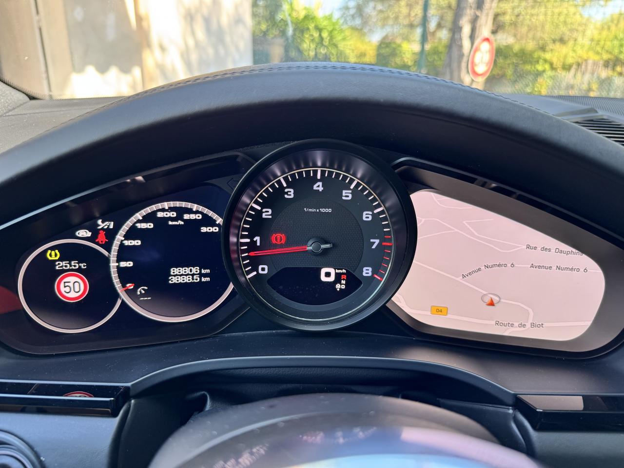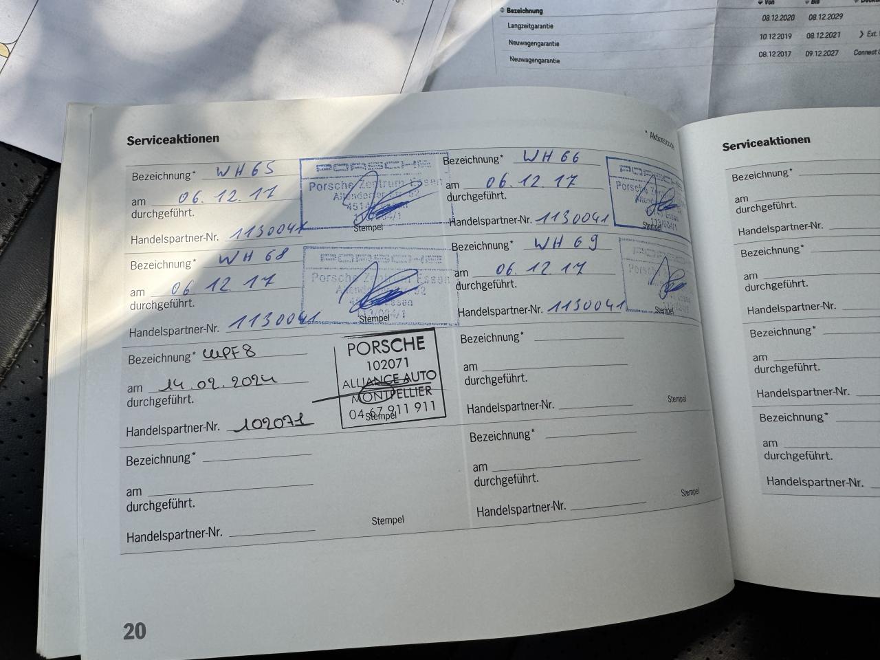 2 ports USB de chargement dans la console centrale arrièreAirbags rideauxAvertisseur de freinage d'urgenceBecquet arrière avec troisième feu de stop à LEDBoîte de vitesse Tiptronic S 8 rapportsClimatisation automatique 2 zones avec réglage individuel de la température pour le conducteur et le passager, commande automatique du recyclage de l'air avec capteur de qualité d'airCompte-tours analogique central avec fond de compteur NoirConcept d’éclairage de l’habitacle à LED : temporisation d’arrêt, éclairage bas d’habitacle avant et arrière, éclairage du cendrier, de la boîte à gants, du démarreurContrôle de pression des pneus ( TPMS )Démarrage sans cléDoubles sorties d’échappement Acier brossé, sur les côtés droit et gaucheFeux arrière à LED avec graphisme tridimensionnel, avec feux stop intégrés 4 points et bandeau lumineuxFrein de parking électriqueHayon automatiqueLimiteur de vitesseMode Individual pour la sélection de réglages sportifs personnalisés du véhiculeMode SPORT PLUS avec réglage axé sur les performances pour le moteur, la boîte de vitesse et le châssisPack intérieur noir, finition brillantePhares à LEDPoignées de portes couleur carrosseriePorsche Active Suspension Management (PASM)Régulateur de châssis intégré PorscheRégulateur de vitesseRétroviseurs extérieurs électriques dégivrants et rabattables électriquement, asphérique côté conducteurSignature « PORSCHE » et bandeau lumineux intégréSuralimentation biturboSystème de stabilité dynamique (PSM)Volant sport multifonctions avec palettes au volant